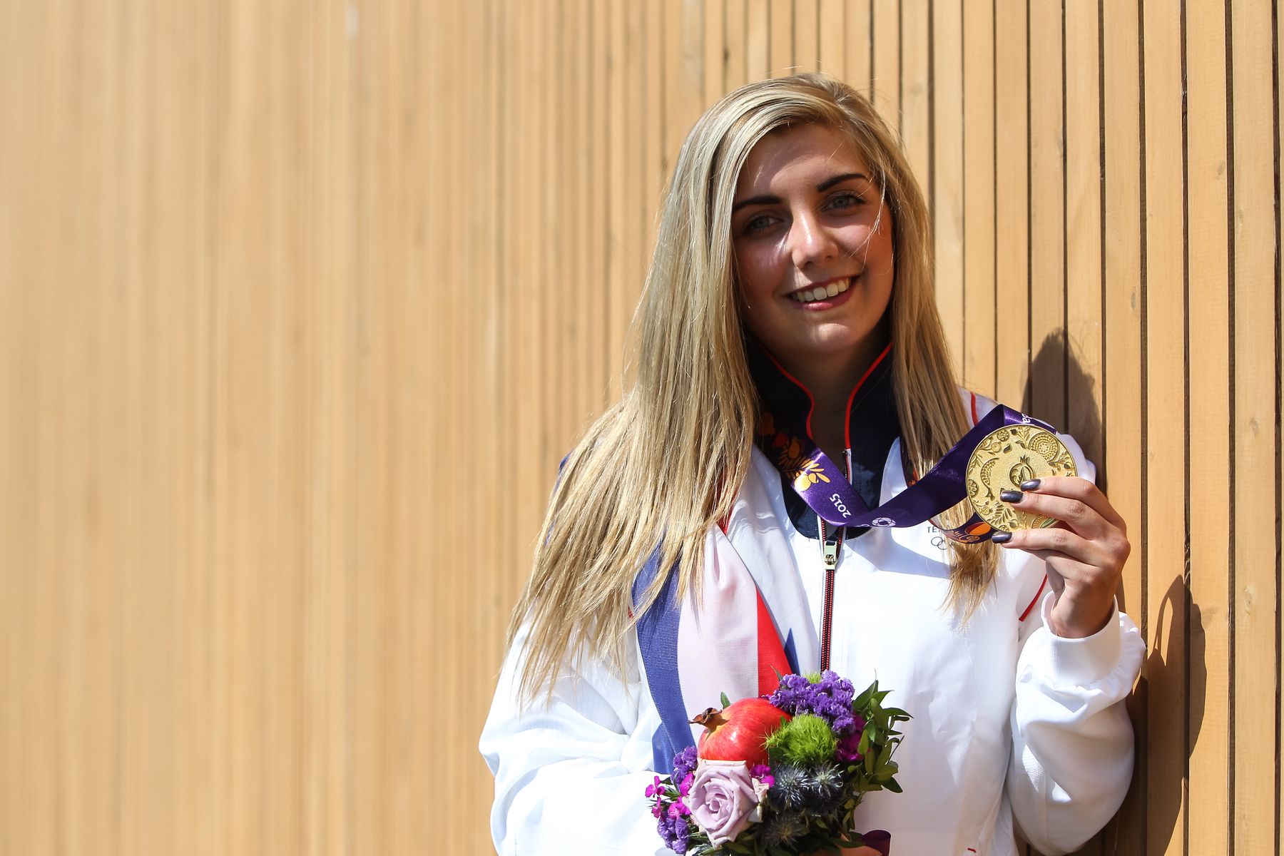 Britain's Amber Hill poses with her medal after winning the Skeet Shooting at the 1st European Games in Baku