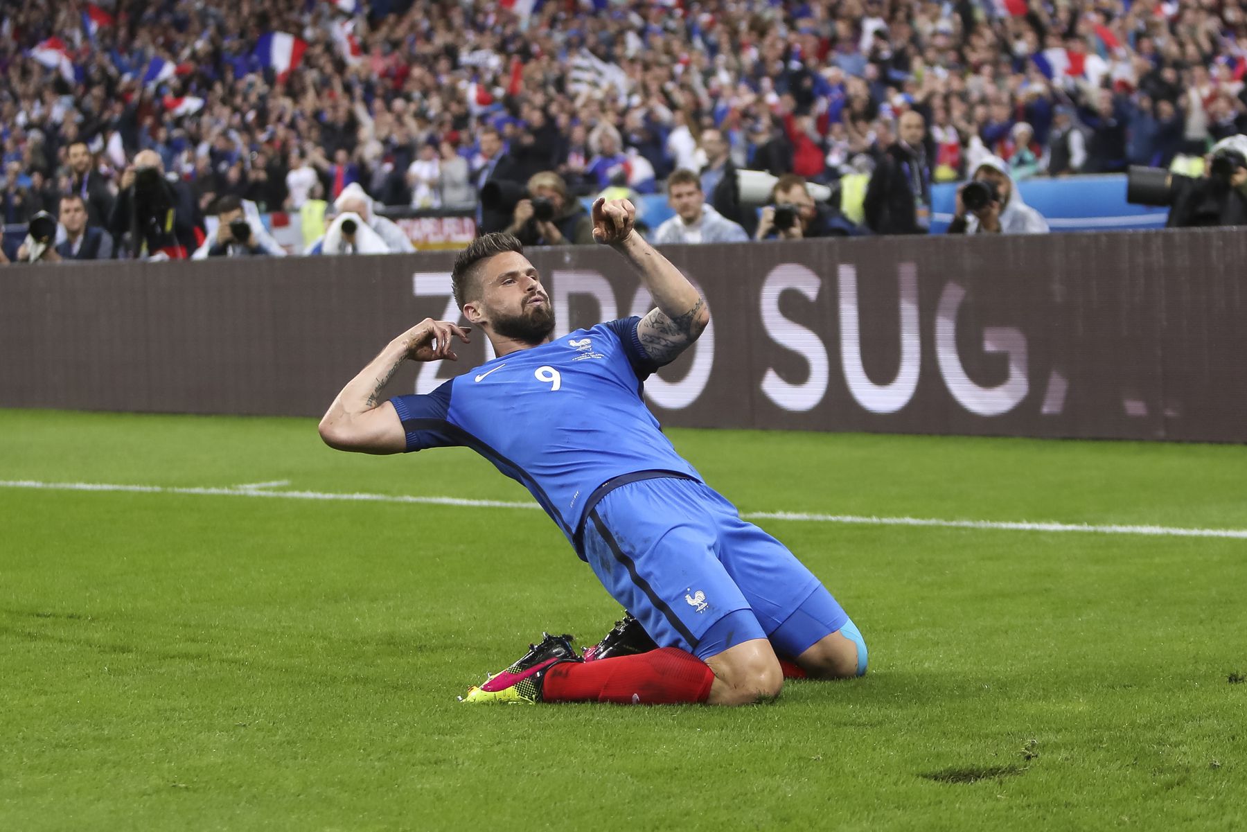 Olivier Giroud and Andre Pierre Gignac celebrate victory over Iceland