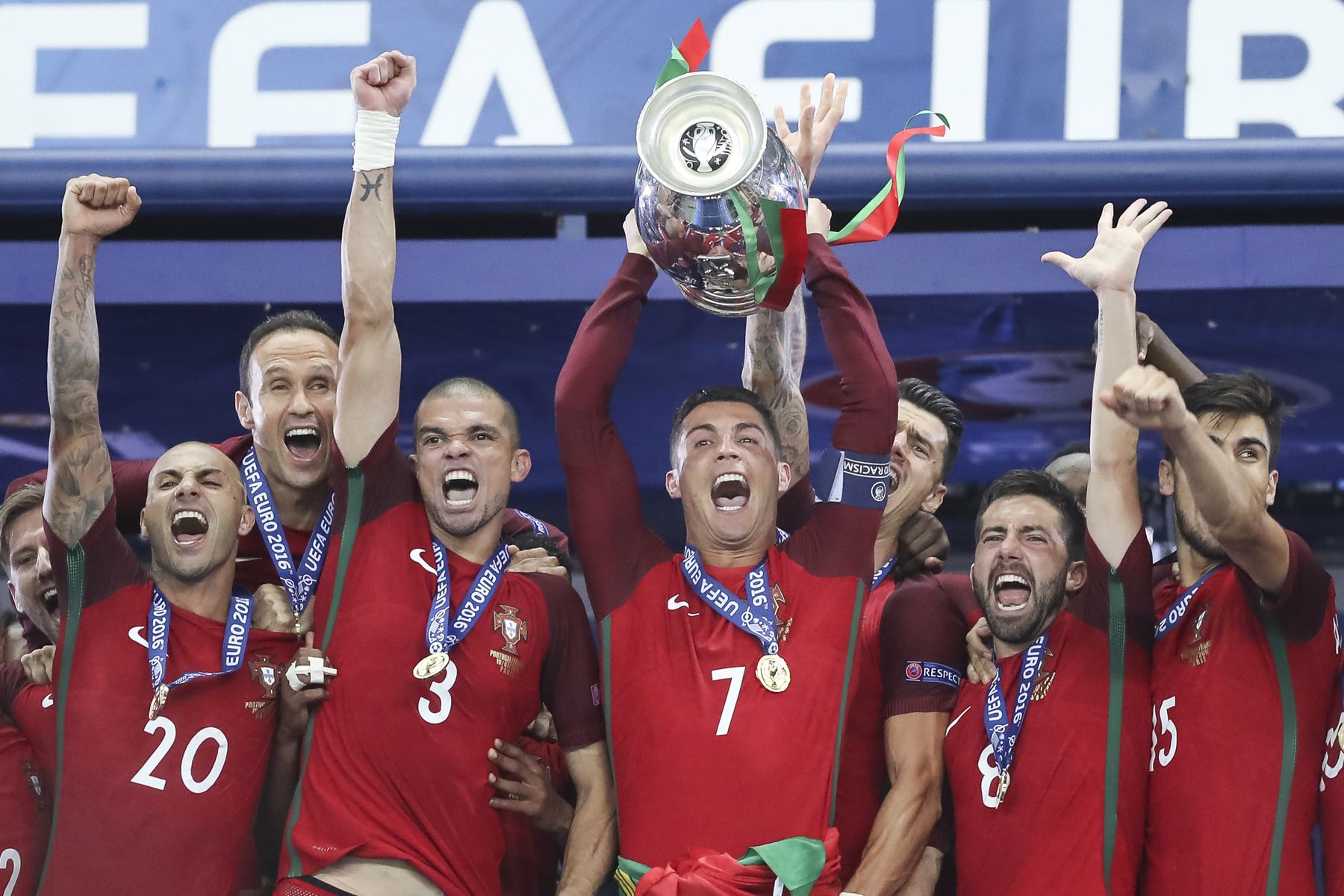 Cristiano Ronaldo of Portugal lifts the Euro 2016 trophy