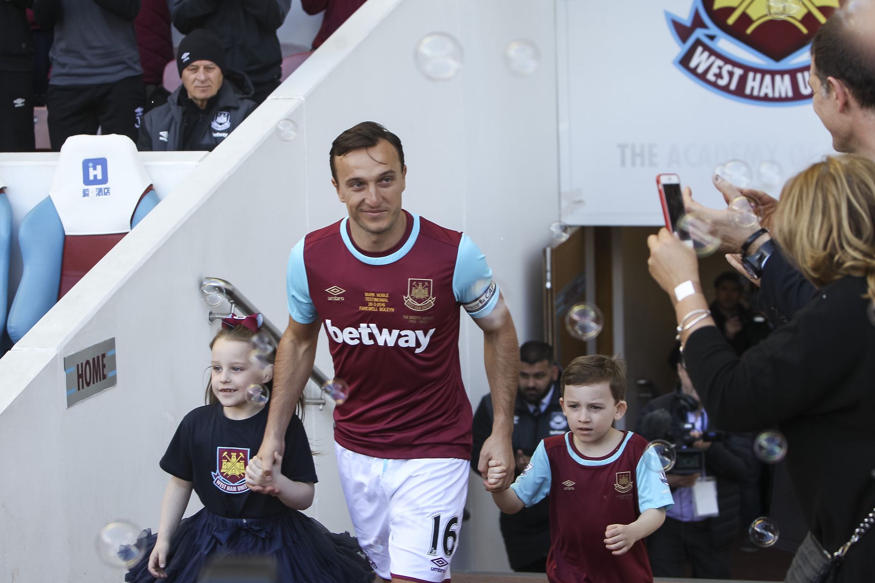 Mark Noble smiles at his wife and manager as he walks out with his children before his testimonial match