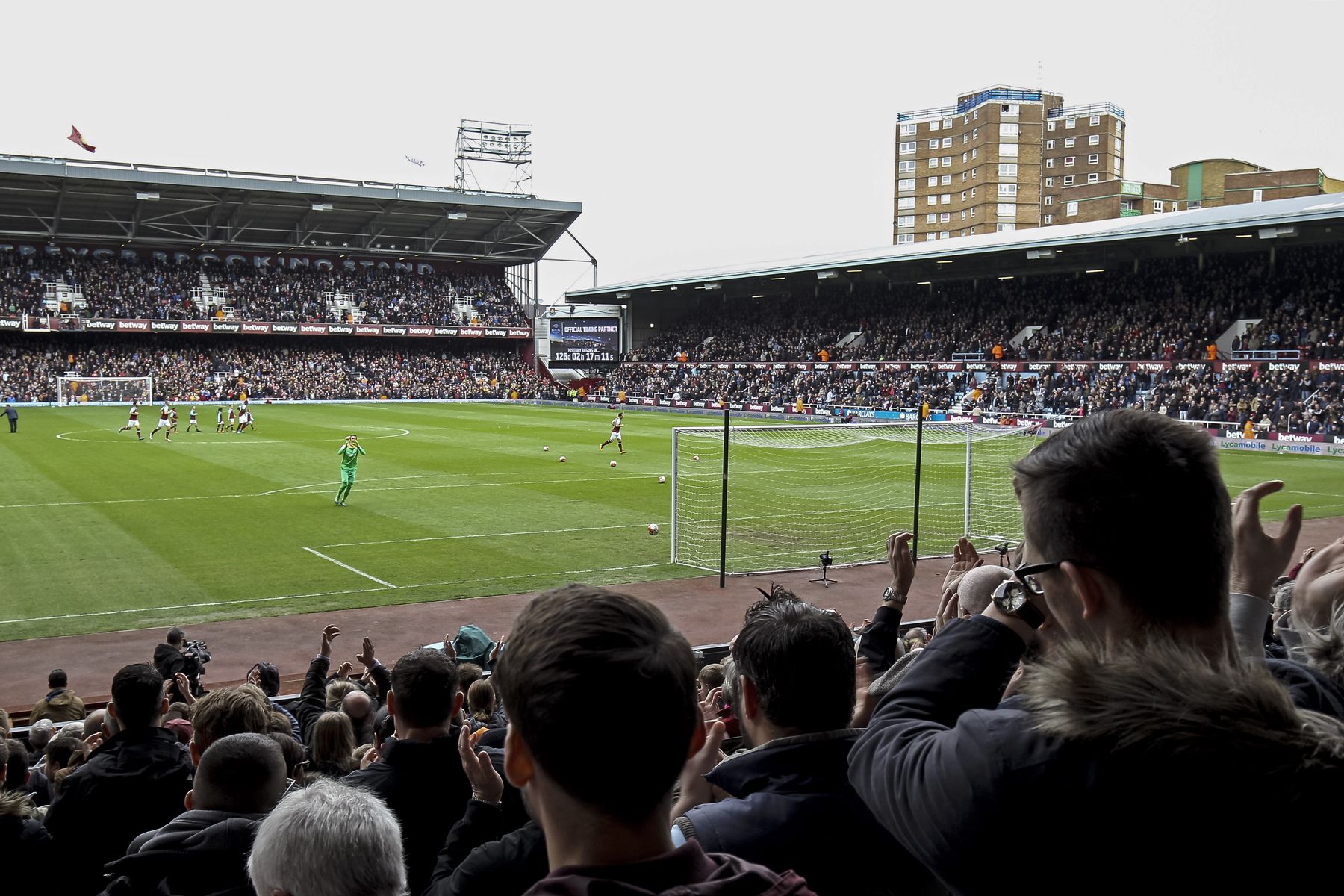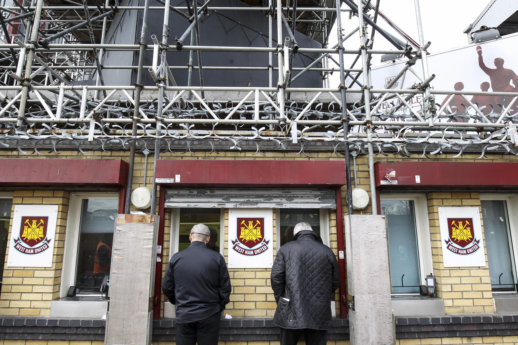 Fans walk past the Bobby Moore stand with old signage for the South Stand showing