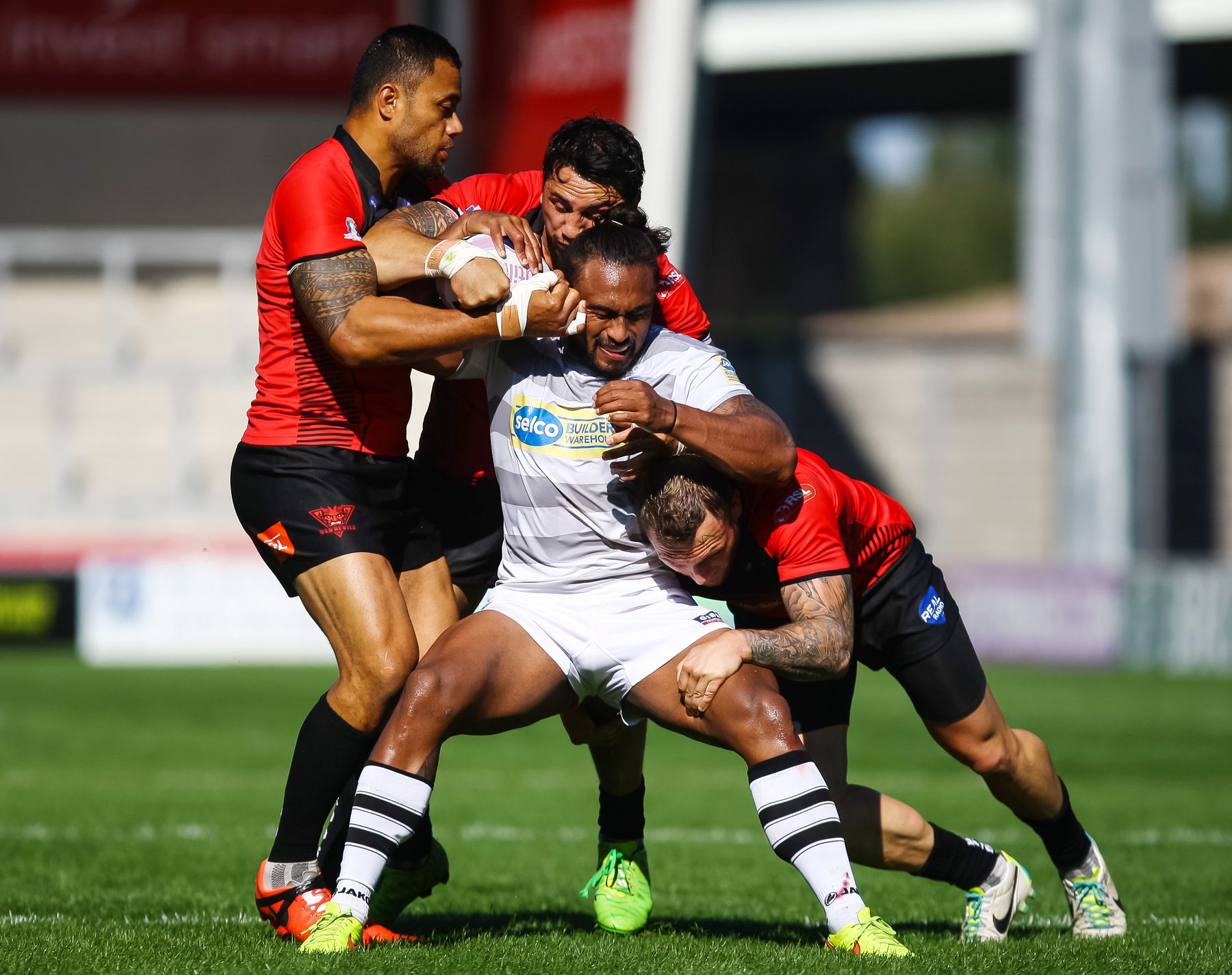 Josh Drinkwater of London Broncos is tackled vs Salford Red Devils