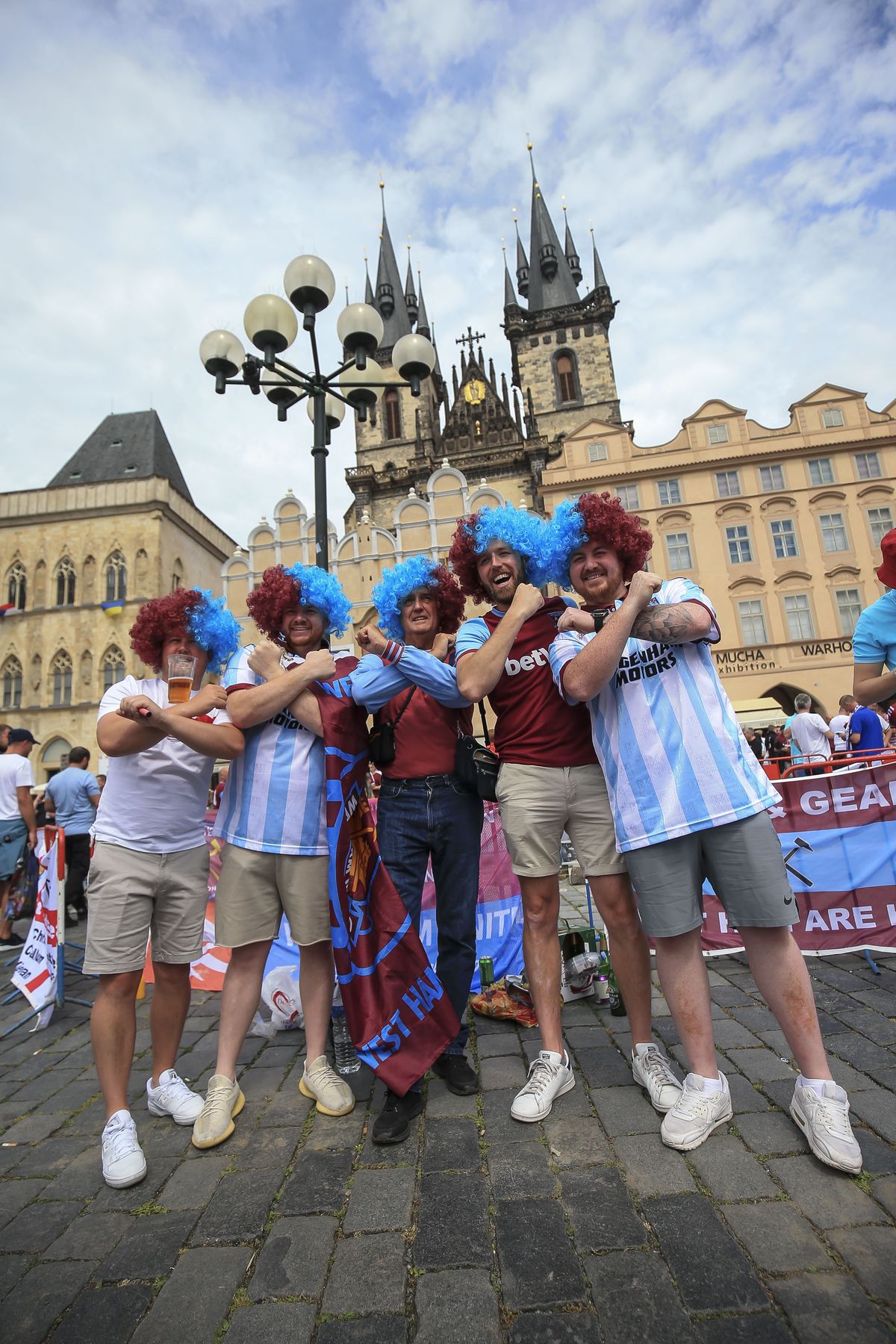 West Ham fans pose in the centre of Prague