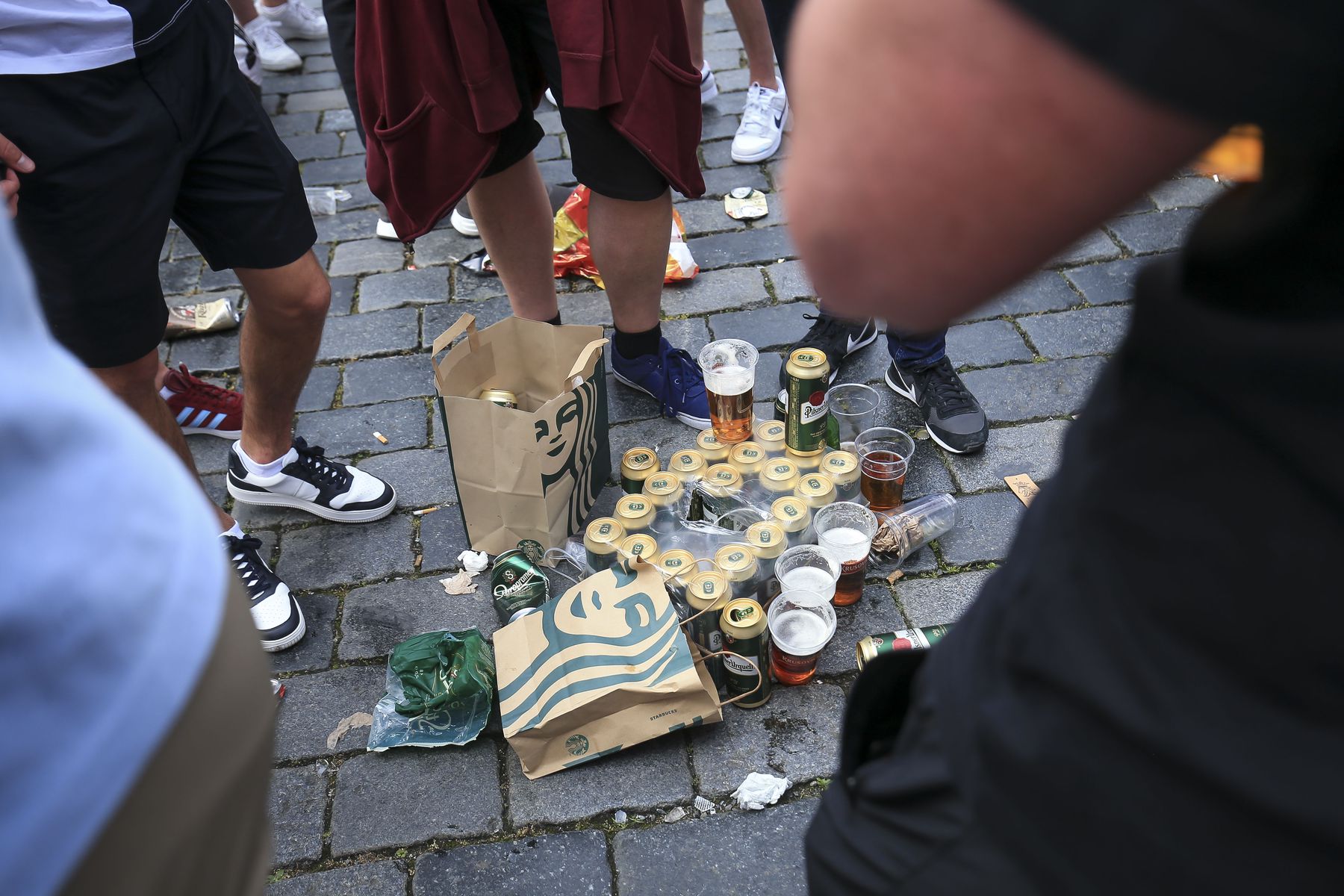 Tourists look on with bemusment as West Ham United fans drink in the centre of Prague