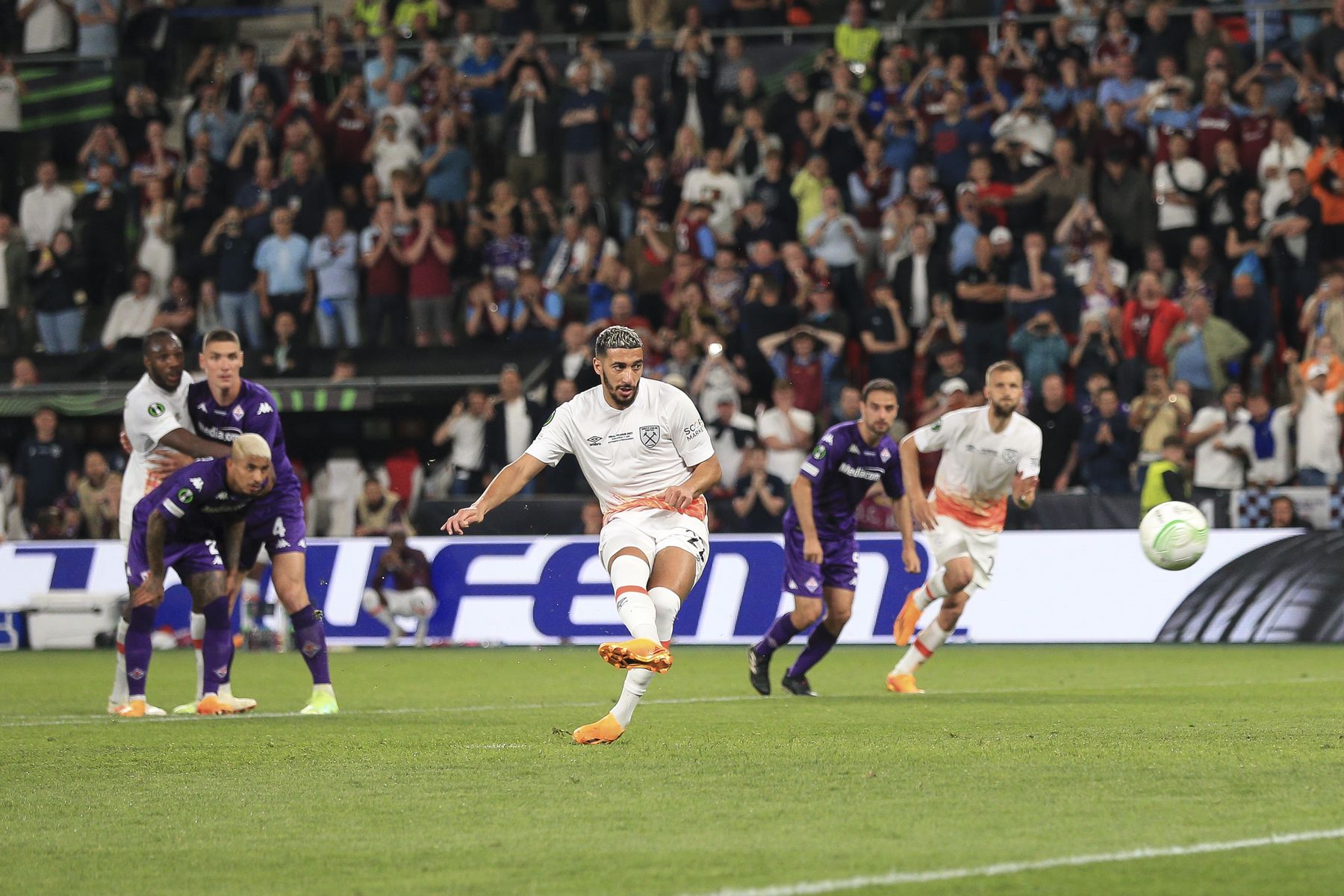 Jarrod Bowen and Michail Antonio appeal for a penalty after a Fiorentina handball