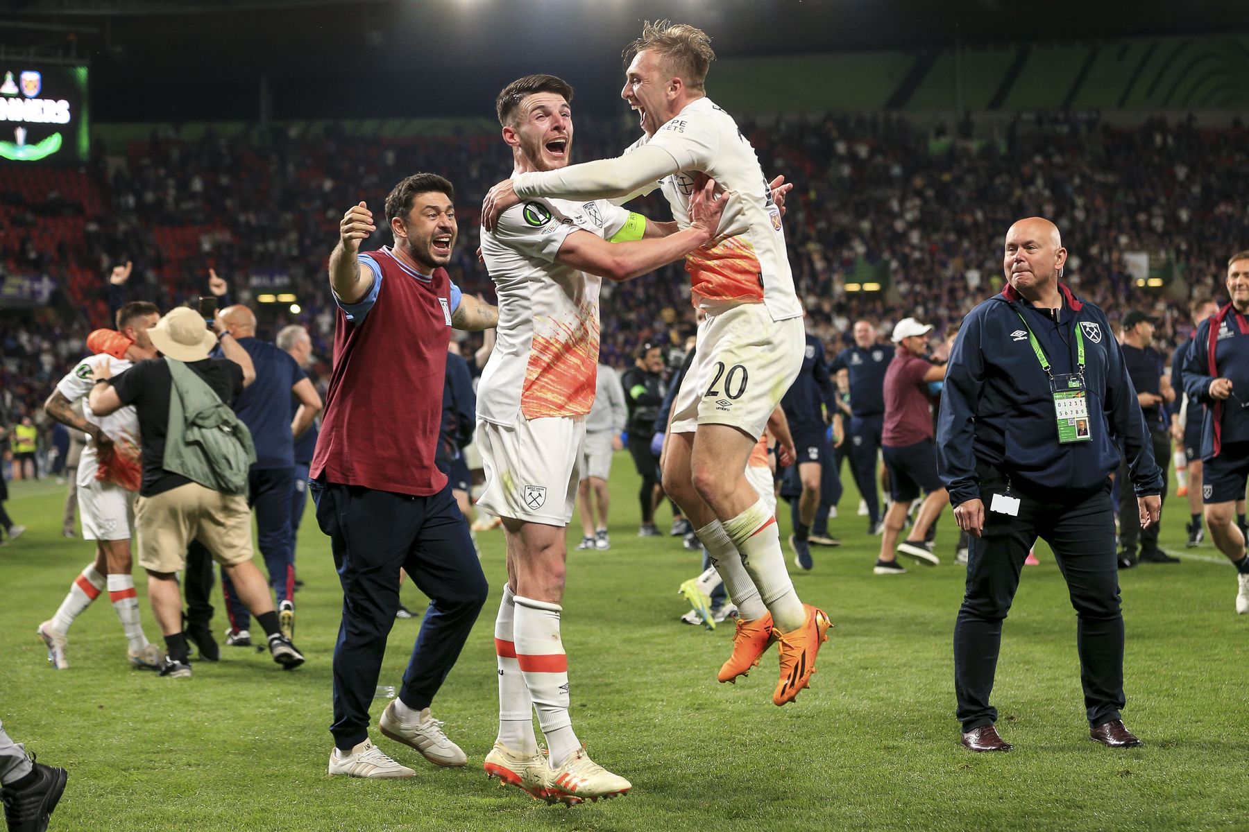 Captain Declan Rice and winning goalscorer Jarrod Bowen celebrate