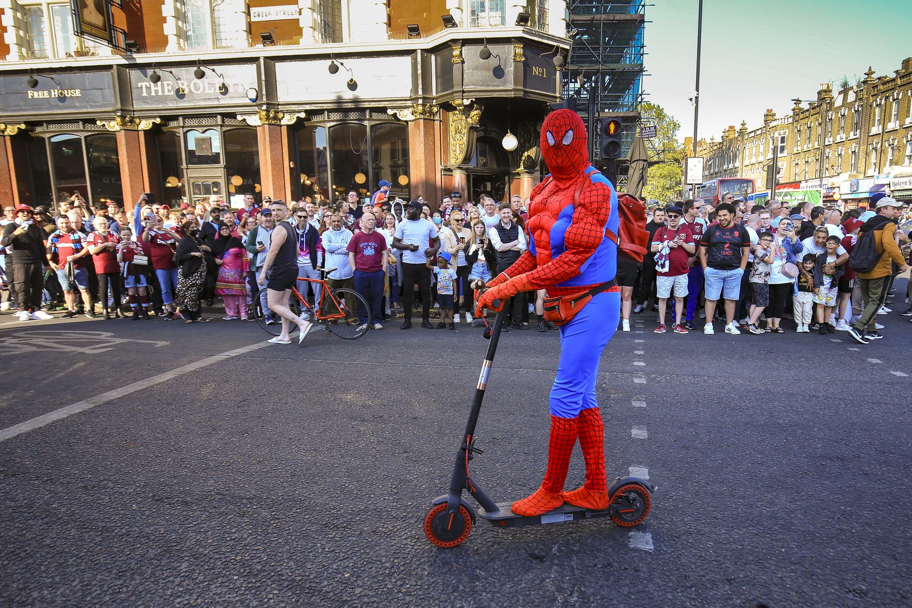 West Ham fans play football as they wait for the parade bus
