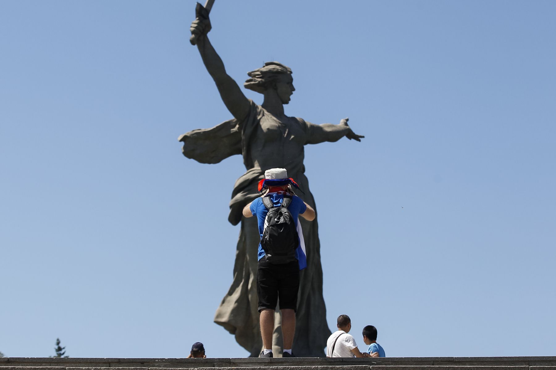 A fan takes a photo of the Motherland Calls statue outside Volgograd Arena