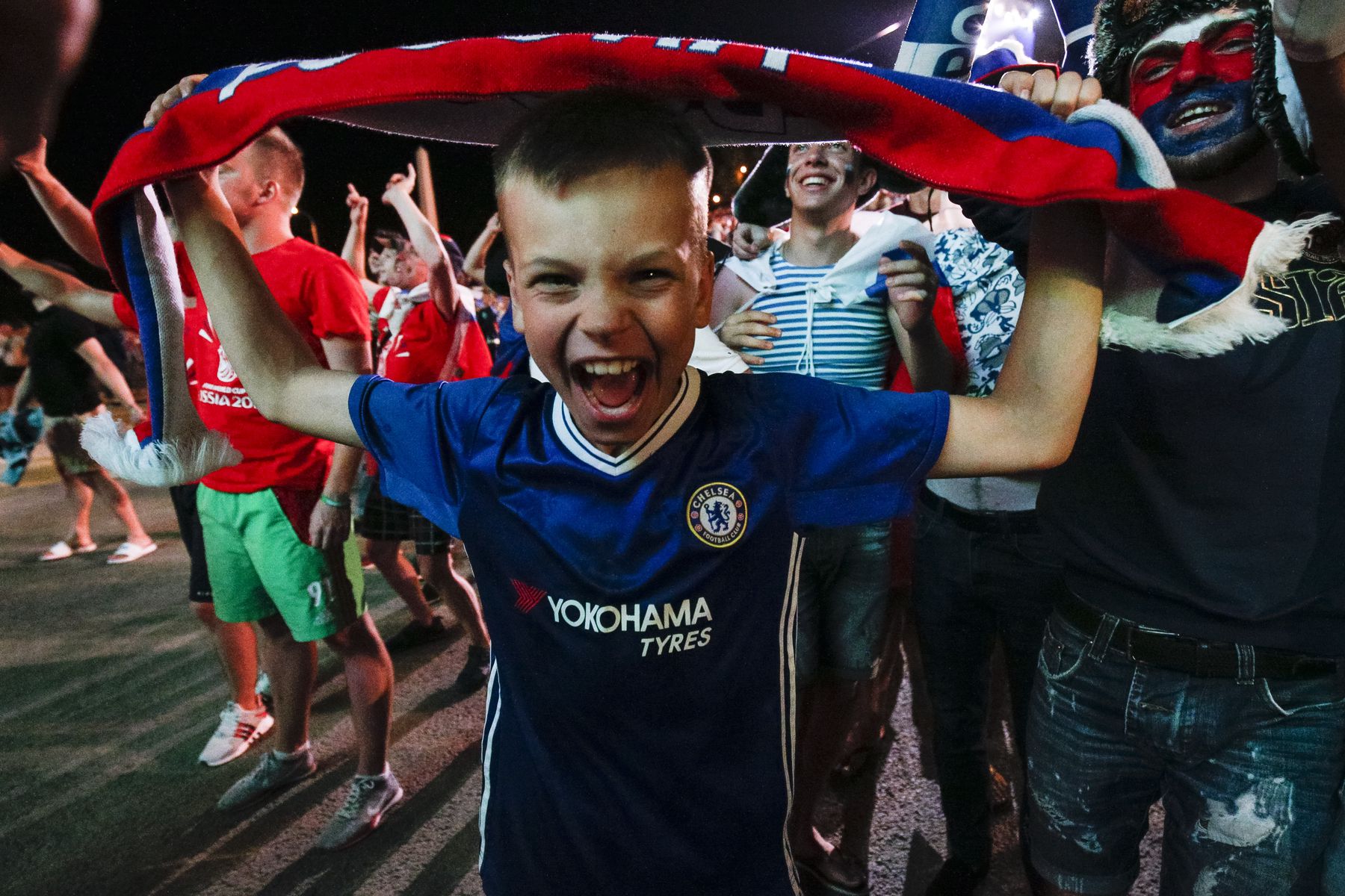 Russian fans celebrate their third goal against Egypt at a FIFA Fan Fest in Volgograd