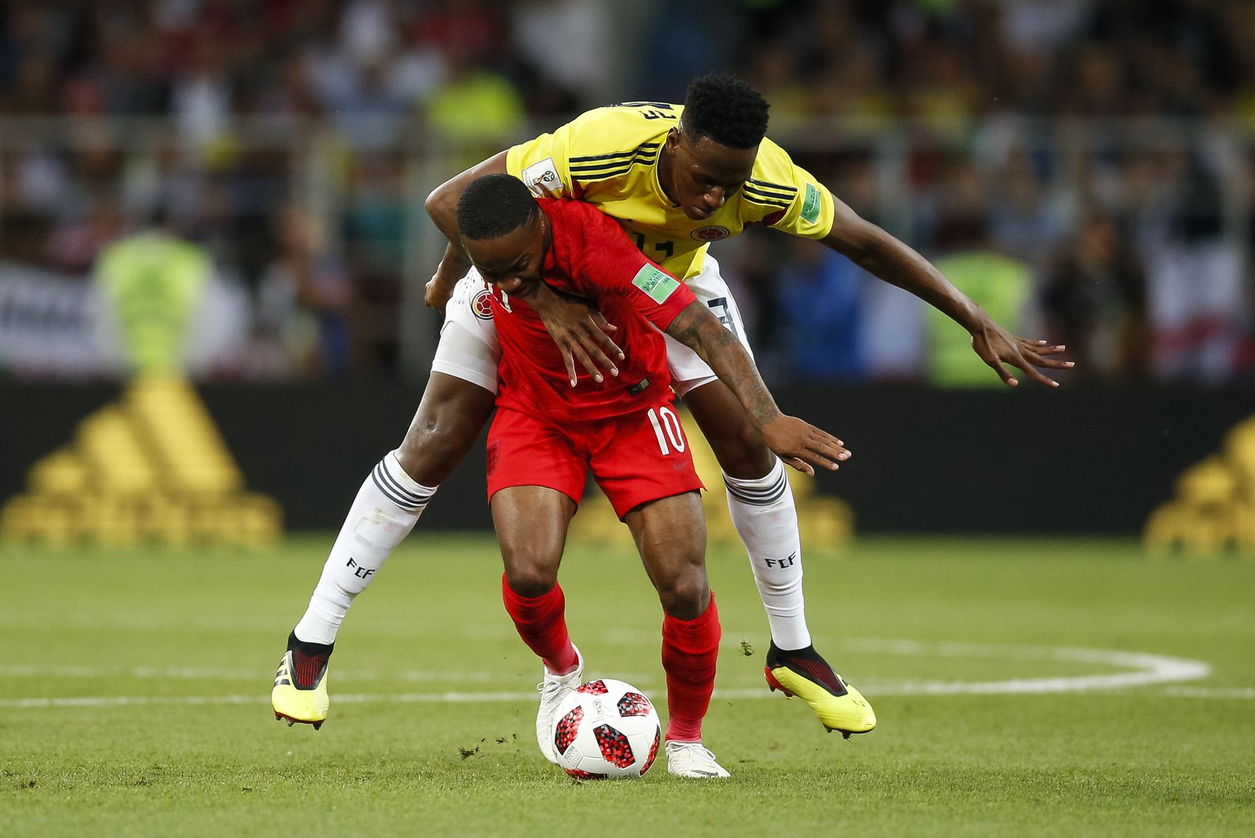 Raheem Sterling is fouled by Colombia's Yerry Mina