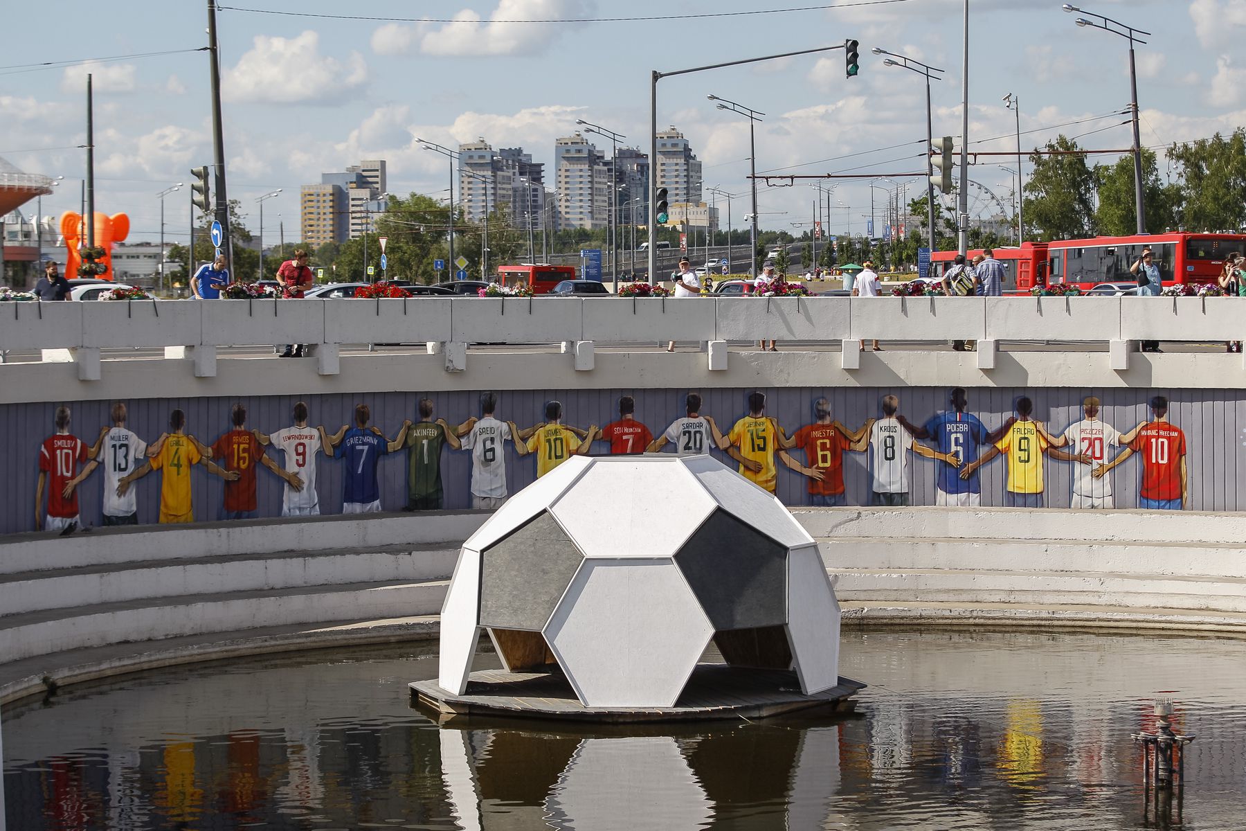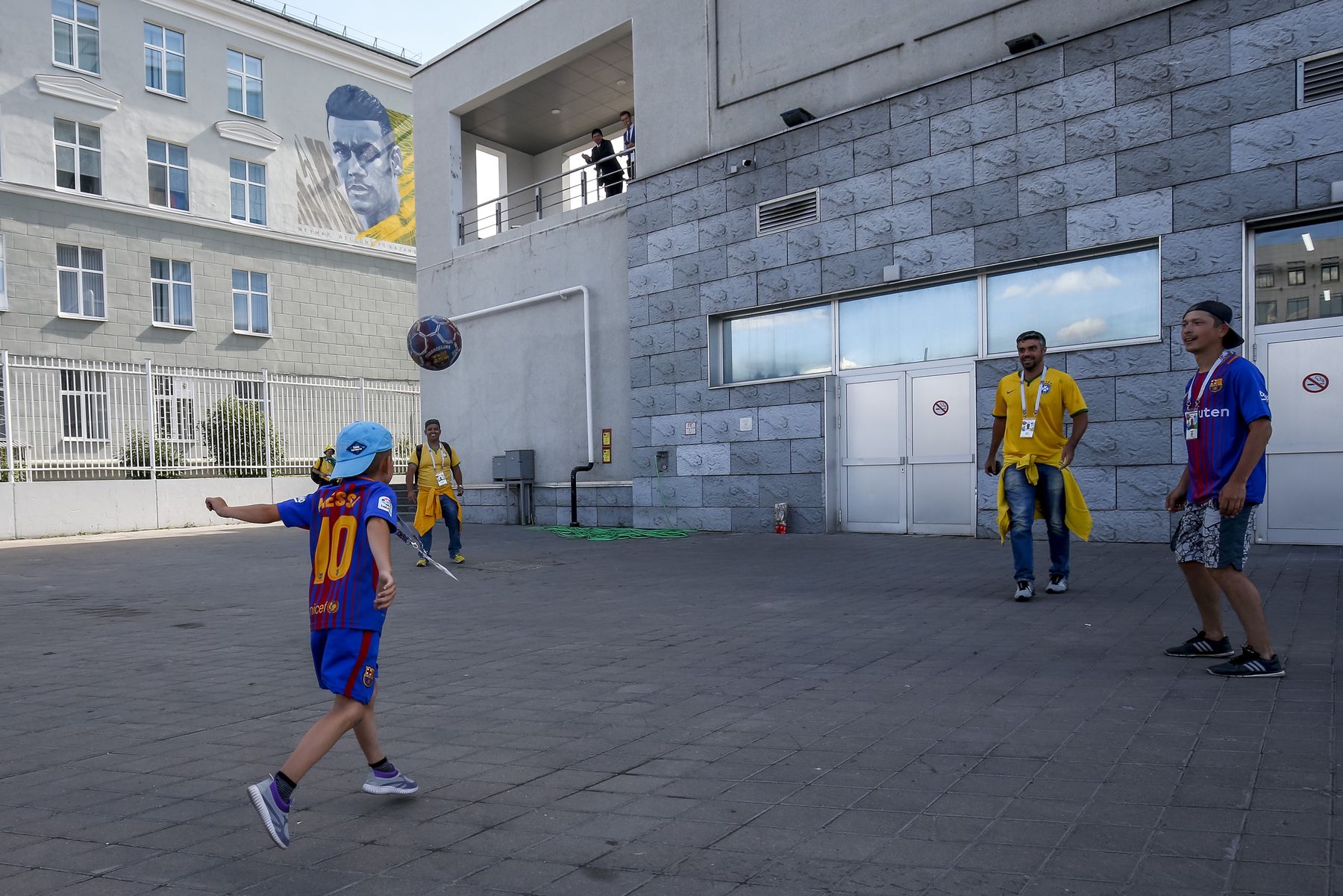 Fans play football in front of a mural of Neymar in Kazan, Russia