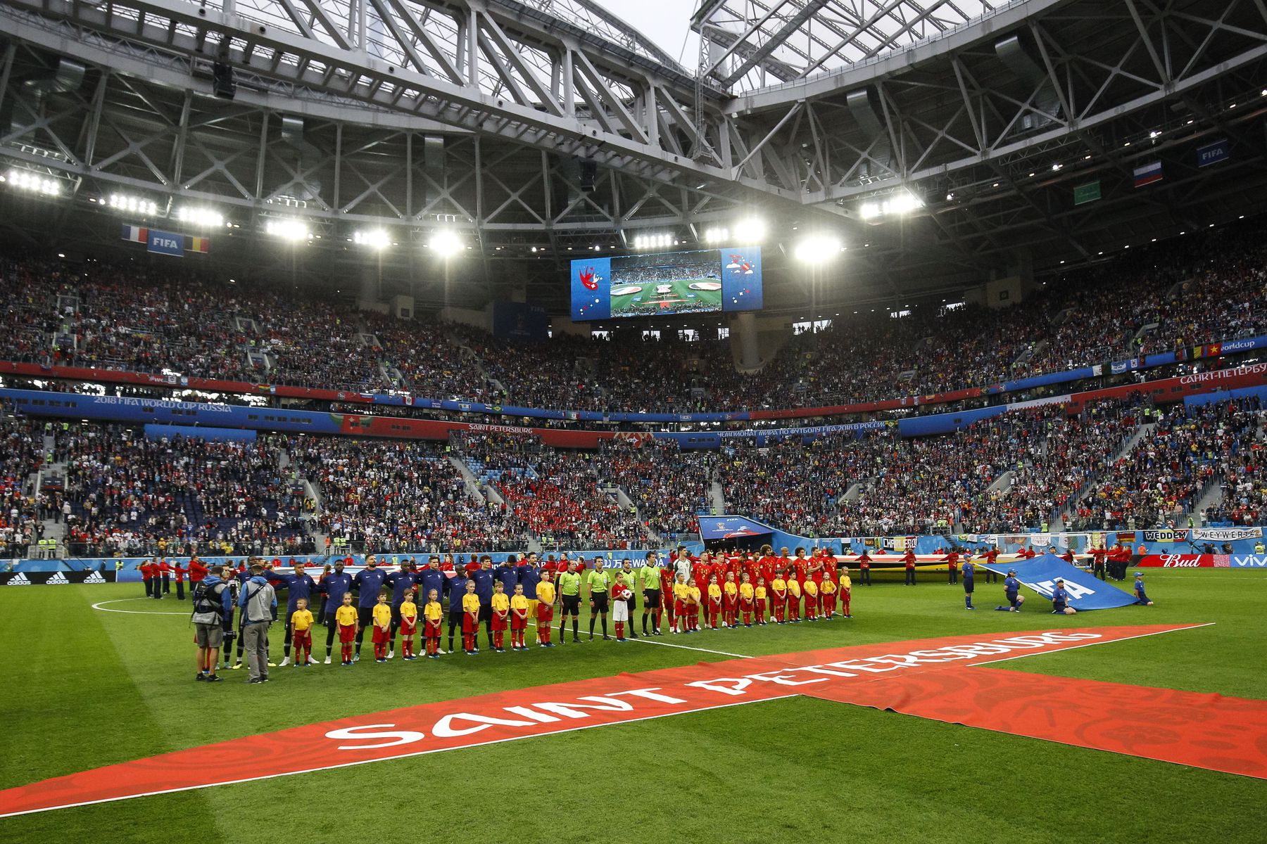 The teams line up before the 2018 FIFA World Cup Semi Final match between France and Belgium