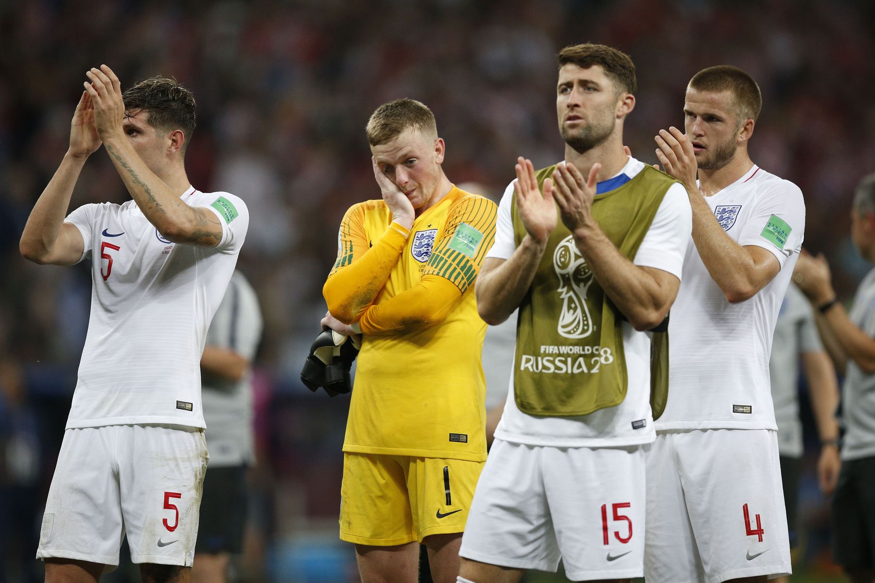 England players look dejected after they lose the 2018 FIFA World Cup Semi Final against Croatia