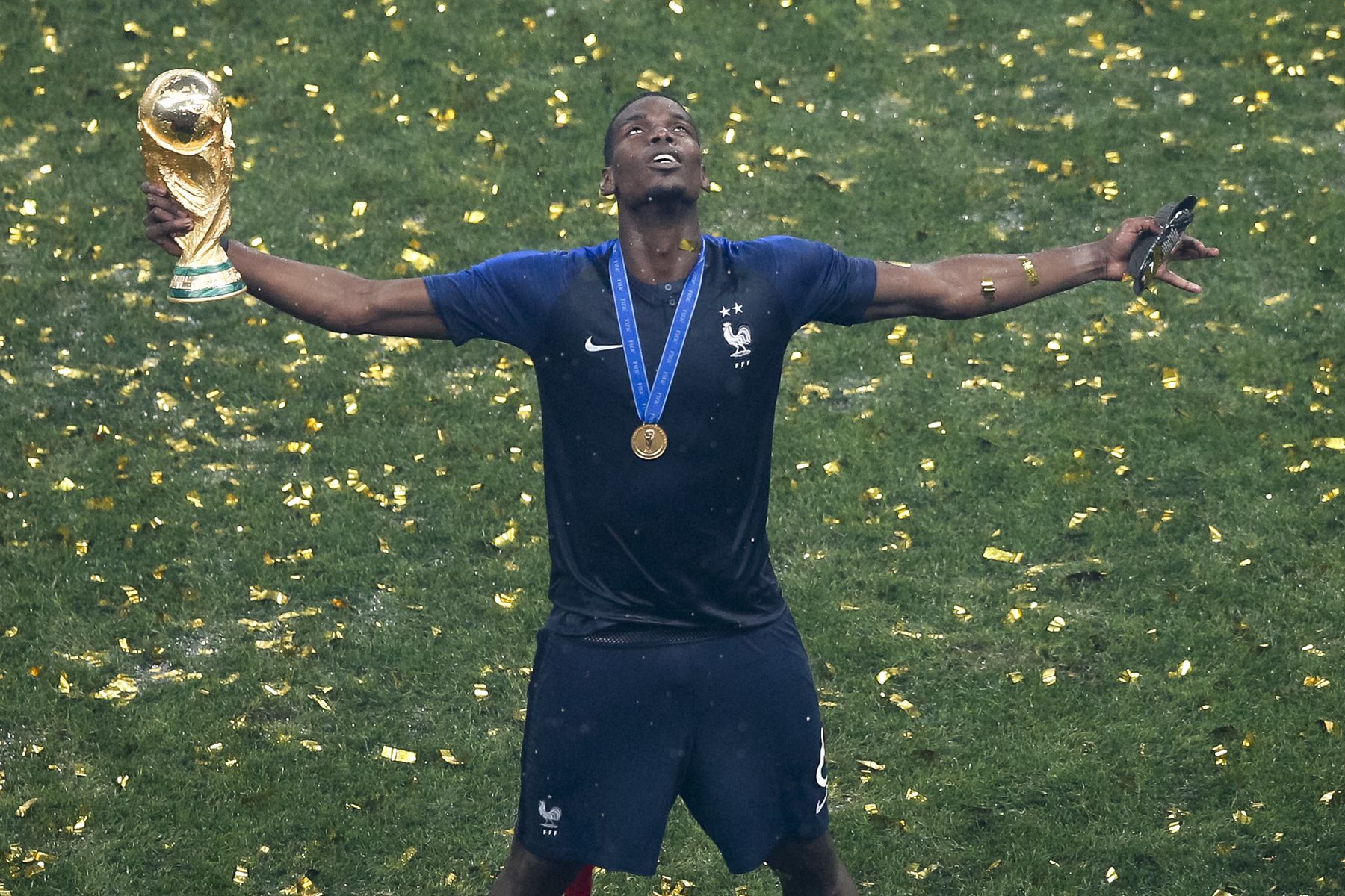 Axel Witsel of Belgium heads the ball watched by Paul Pogba of France